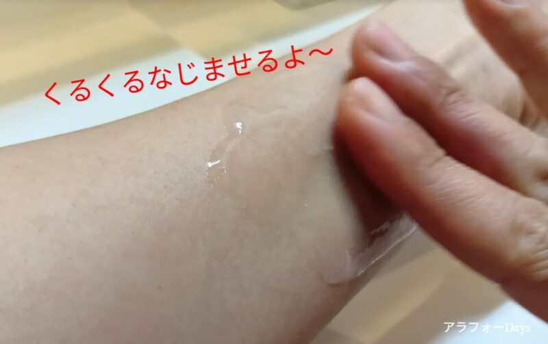 まずは使用感を確かめるため、ジェルを出して腕で試してみました。腕にジェルをのせて、指の腹でくるくると円を描くようにマッサージ。