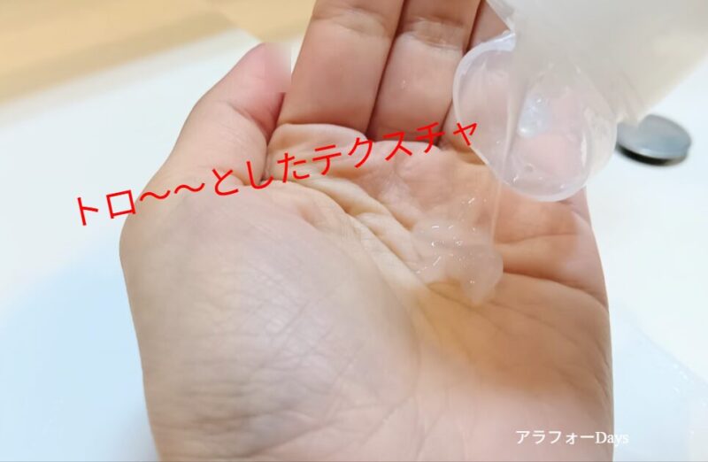 テクスチャは、トロ~っとした少しゆるめの半透明ジェル。出すぎてしまうことがあるので、手に出す際には注意が必要です。
